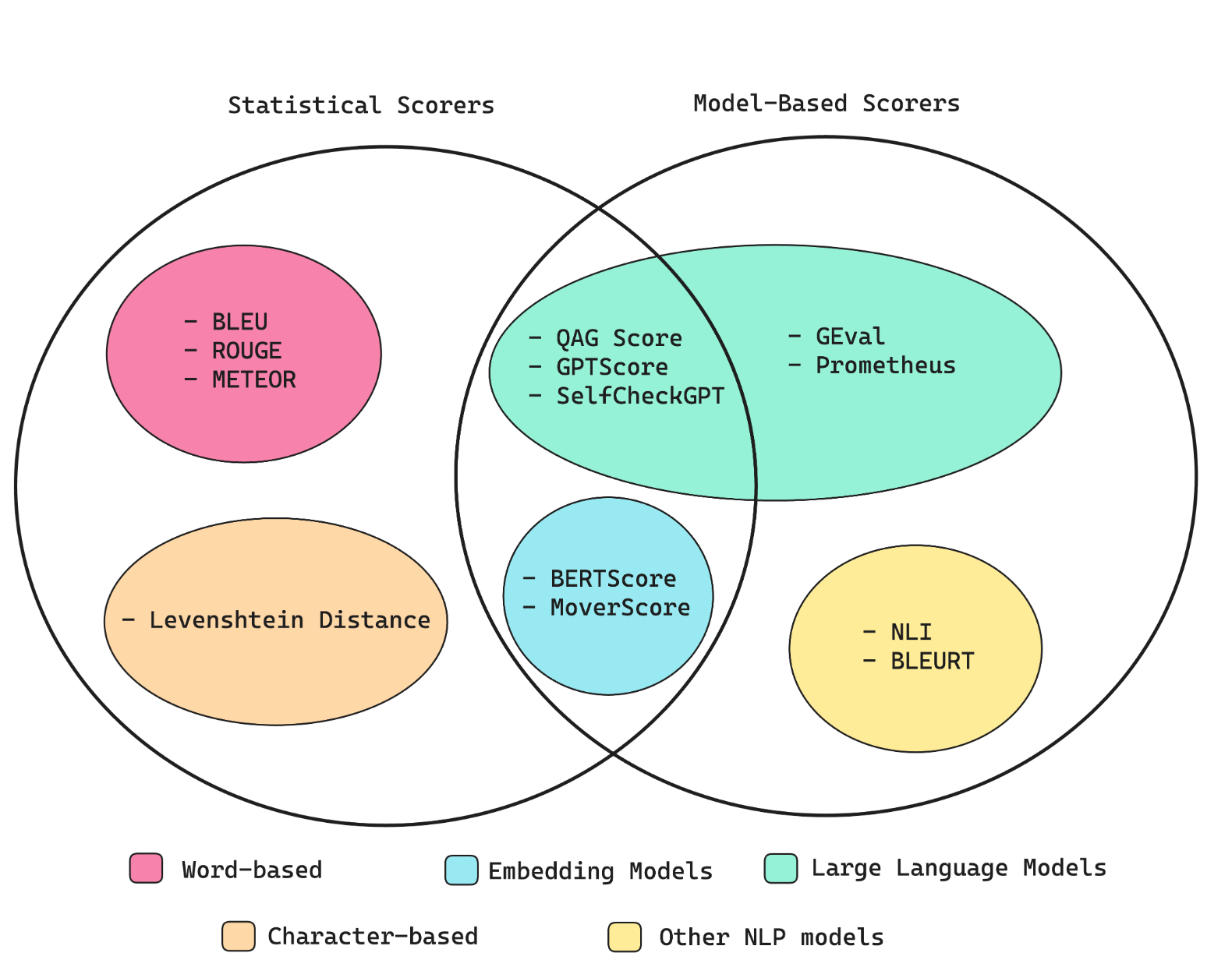 由于纯统计评分器几乎不考虑任何语义并且推理能力极其有限,因此它们对于评估通常很长且复杂的 LLM 输出来说不够准确。