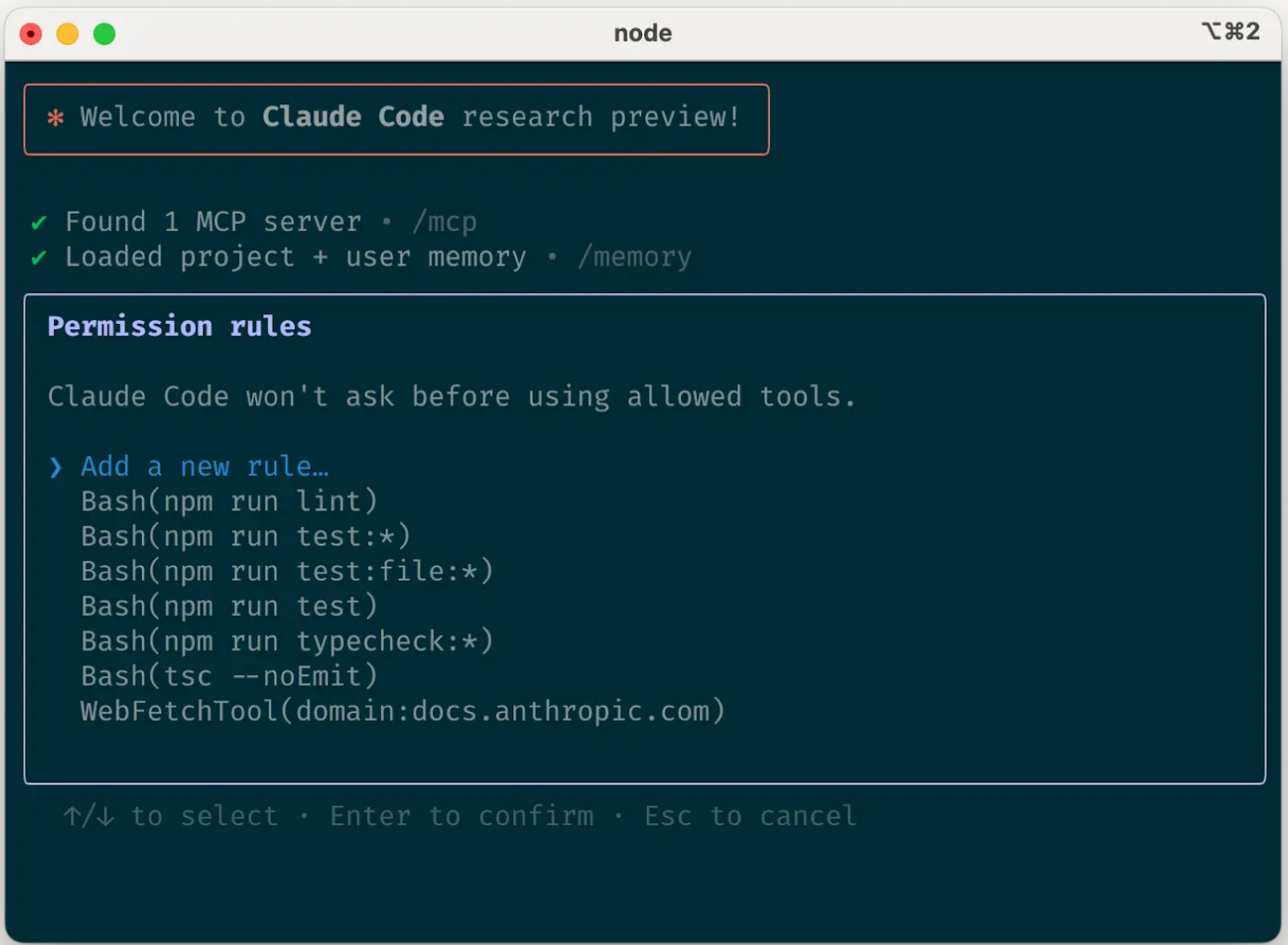- 启动Claude Code后,使用/permissions命令可在白名单中添加或移除工具。例如,您可以添加“Edit”以始终允许文件编辑,添加“Bash(git commit:*)”以允许进行git提交,或添加“mcp__puppeteer__puppeteer_navigate”以允许使用Puppeteer MCP服务器进行导航。