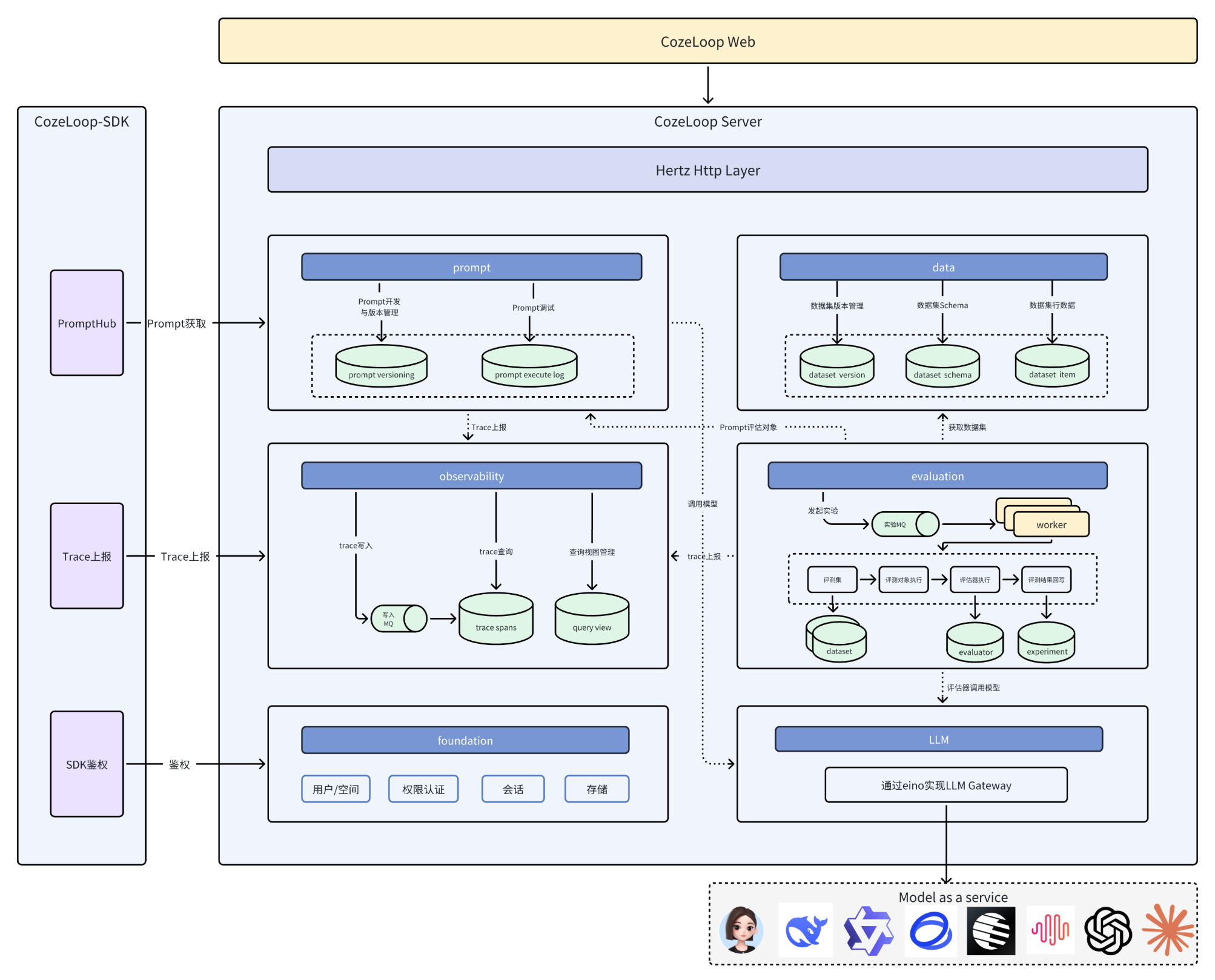 Coze loop采用微服务架构,基于领域驱动设计(DDD)原则构建,为AI应用程序开发和运营提供一站式平台。总体架构如下:
