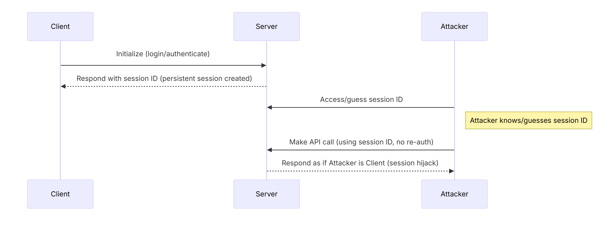 - 会话劫持是一种攻击向量,其中服务器向客户端提供会话ID,未经授权的一方能够获得并使用同一会话ID来模拟原始客户端并代表其执行未经授权操作。